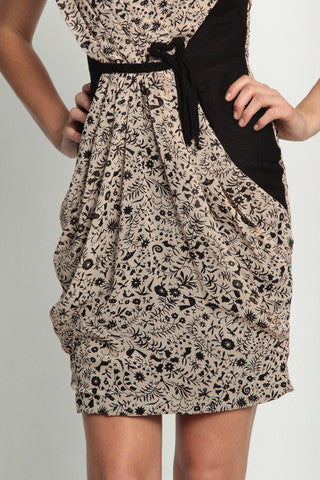 Topping our best-seller list, this elegant flowing number features a pleated bodice and a ruched waist for some extra flare. With a neutral palette of flowers combined with cute critters is an effortless take on the hot new floral trend. All you need is a pair of heels and a fun clutch to complete your look.